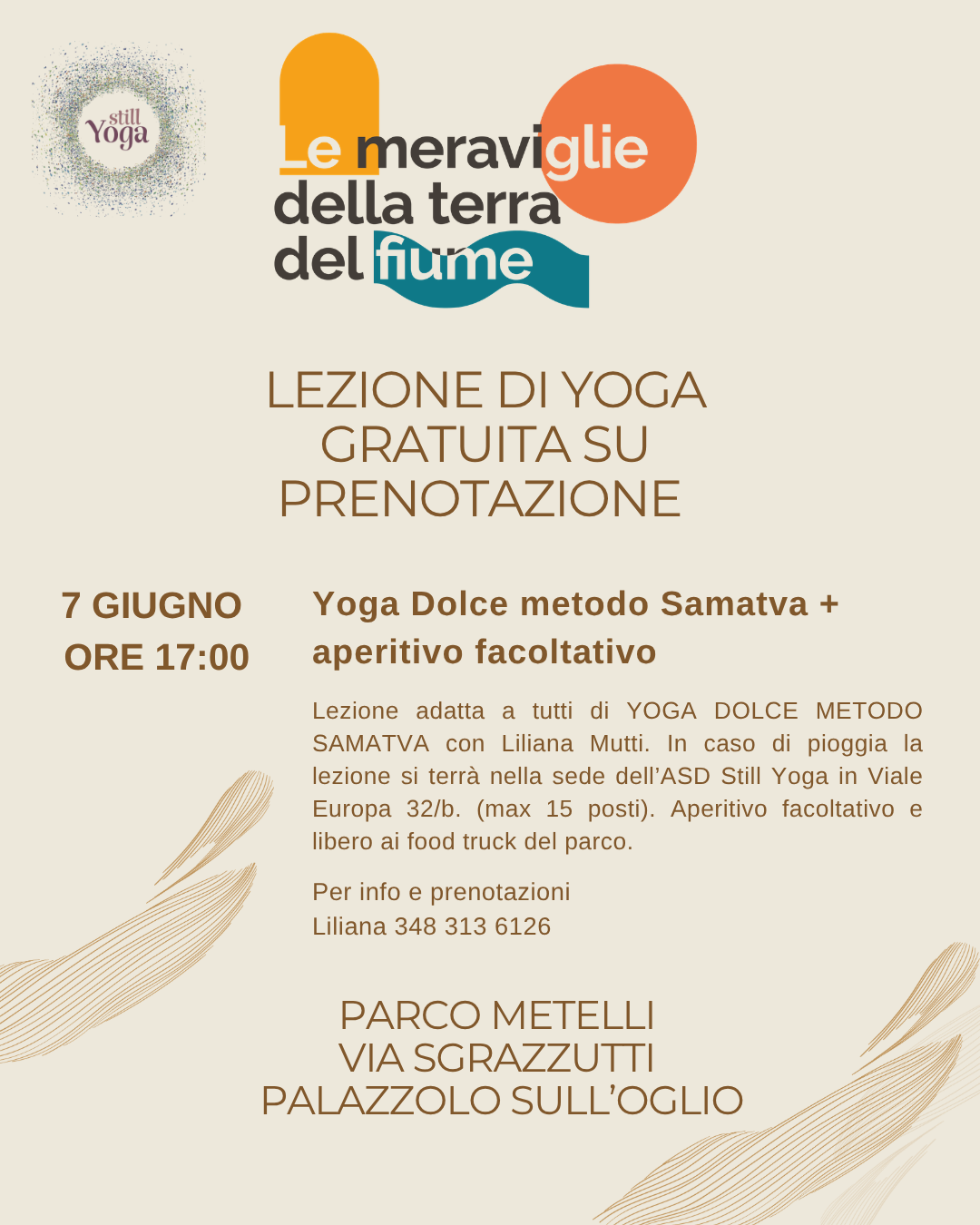 In caso di pioggia la lezione si terrà nella sede dell’ASD Still Yoga in Viale Europa 32/b. (max 15 posti, precedenza ai primi iscritti).