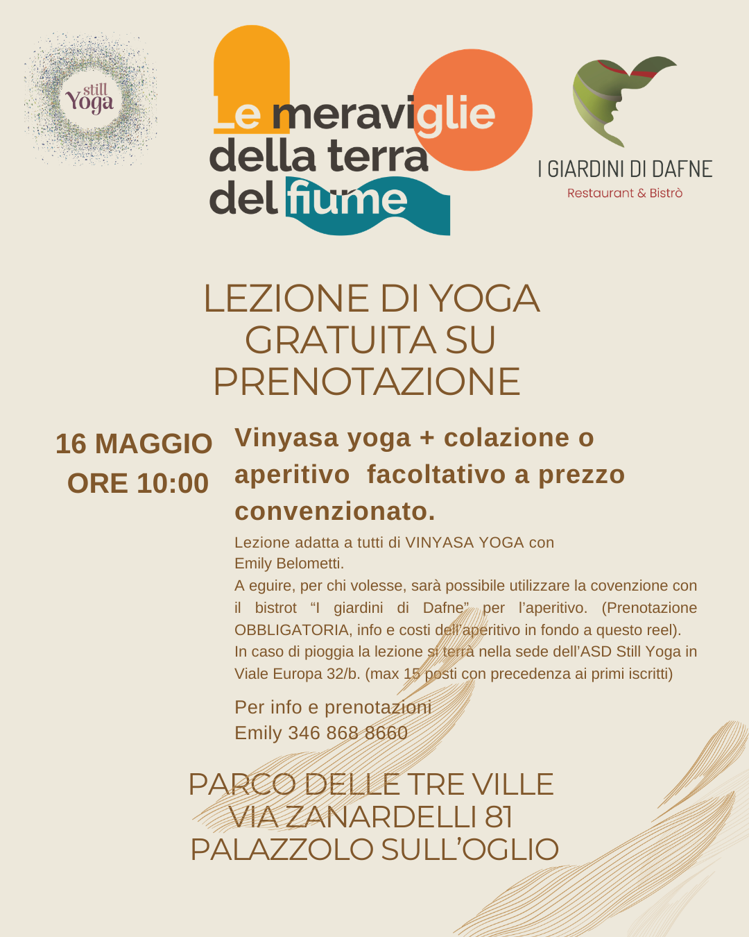 In caso di pioggia la lezione si terrà nella sede dell’ASD Still Yoga in Viale Europa 32/b. (max 15 posti, precedenza ai primi iscritti).